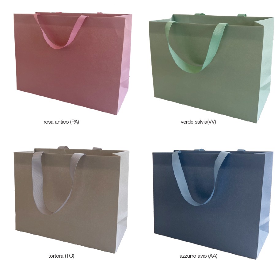Disponibili in quattro colori di tendenza – rosa antico, verde salvia, tortora e azzurro avio – e in due misure, queste borse donano un tocco premium ad ogni confezione.
